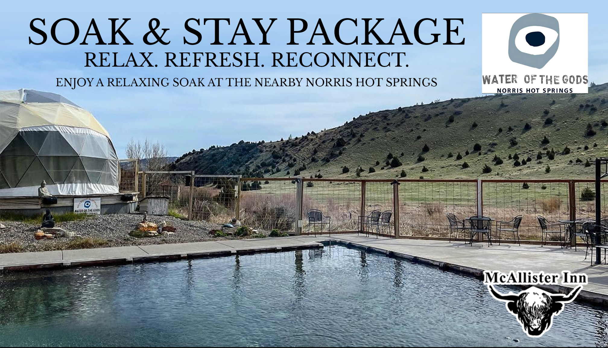 Relax, Refresh, and Reconnect with Our Soak & Stay Package Make your Montana escape truly unforgettable with our Soak & Stay offer at McAllister Inn. Pair your cozy accommodations with a soothing soak at Norris Hot Springs, just a short drive away.